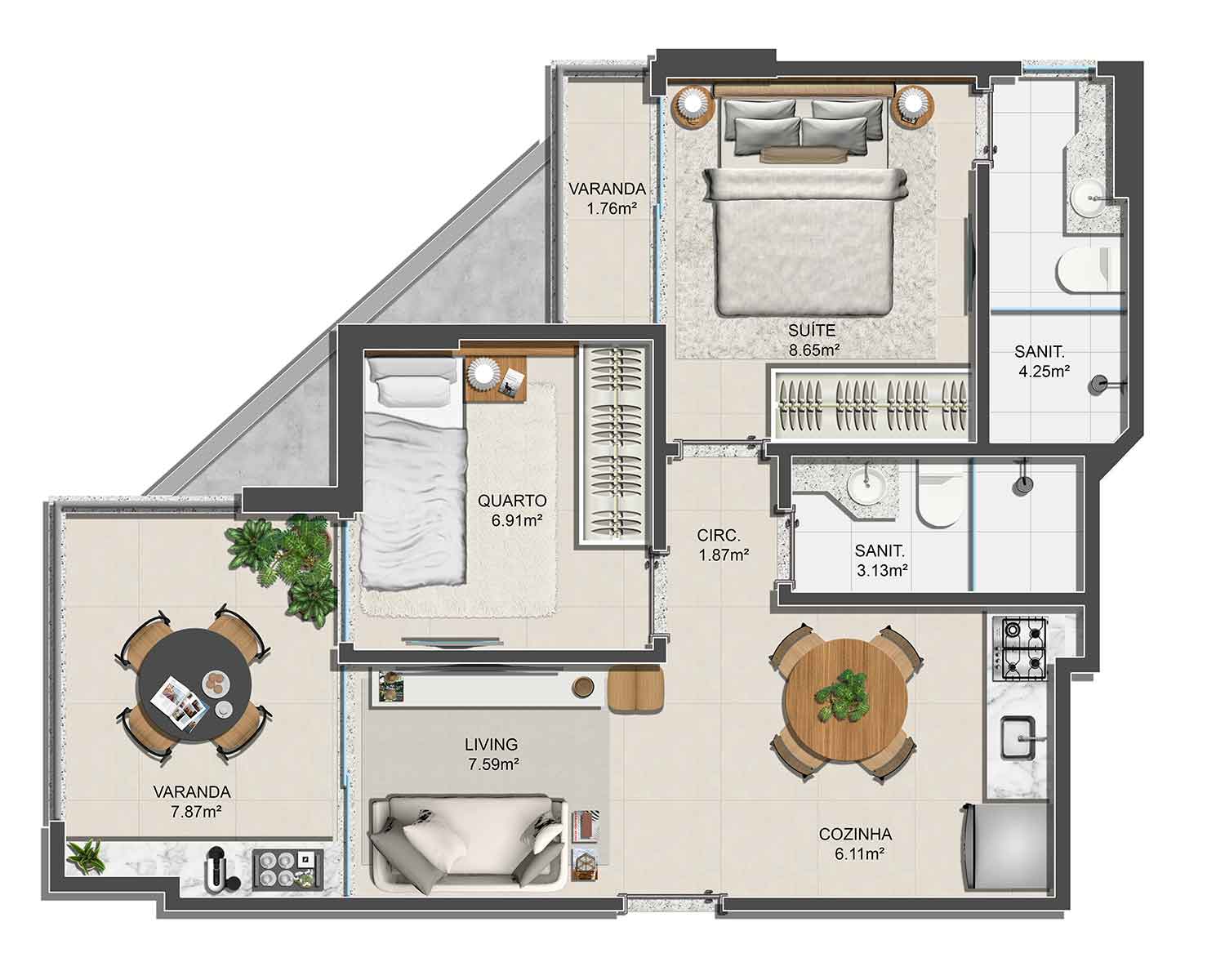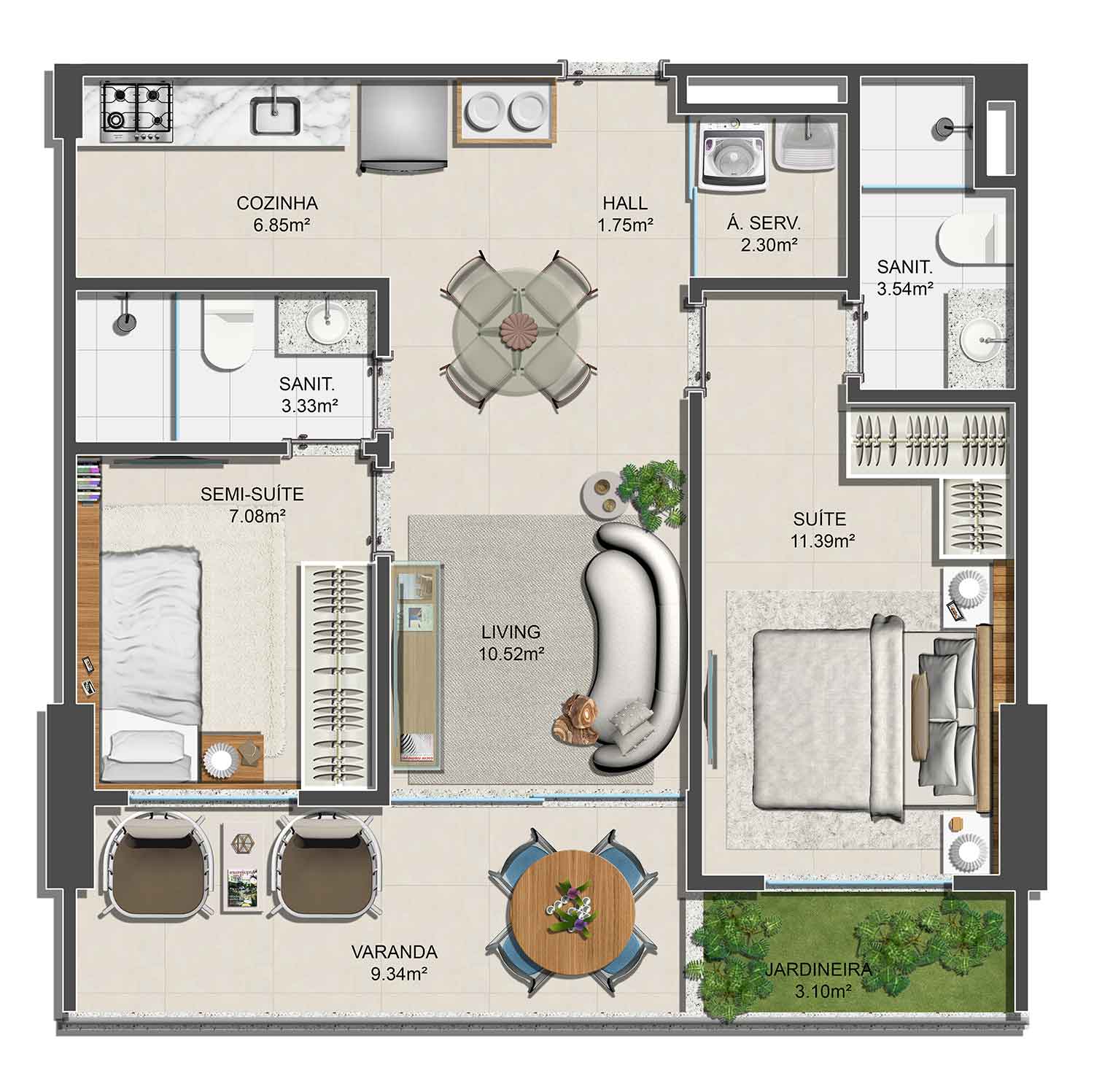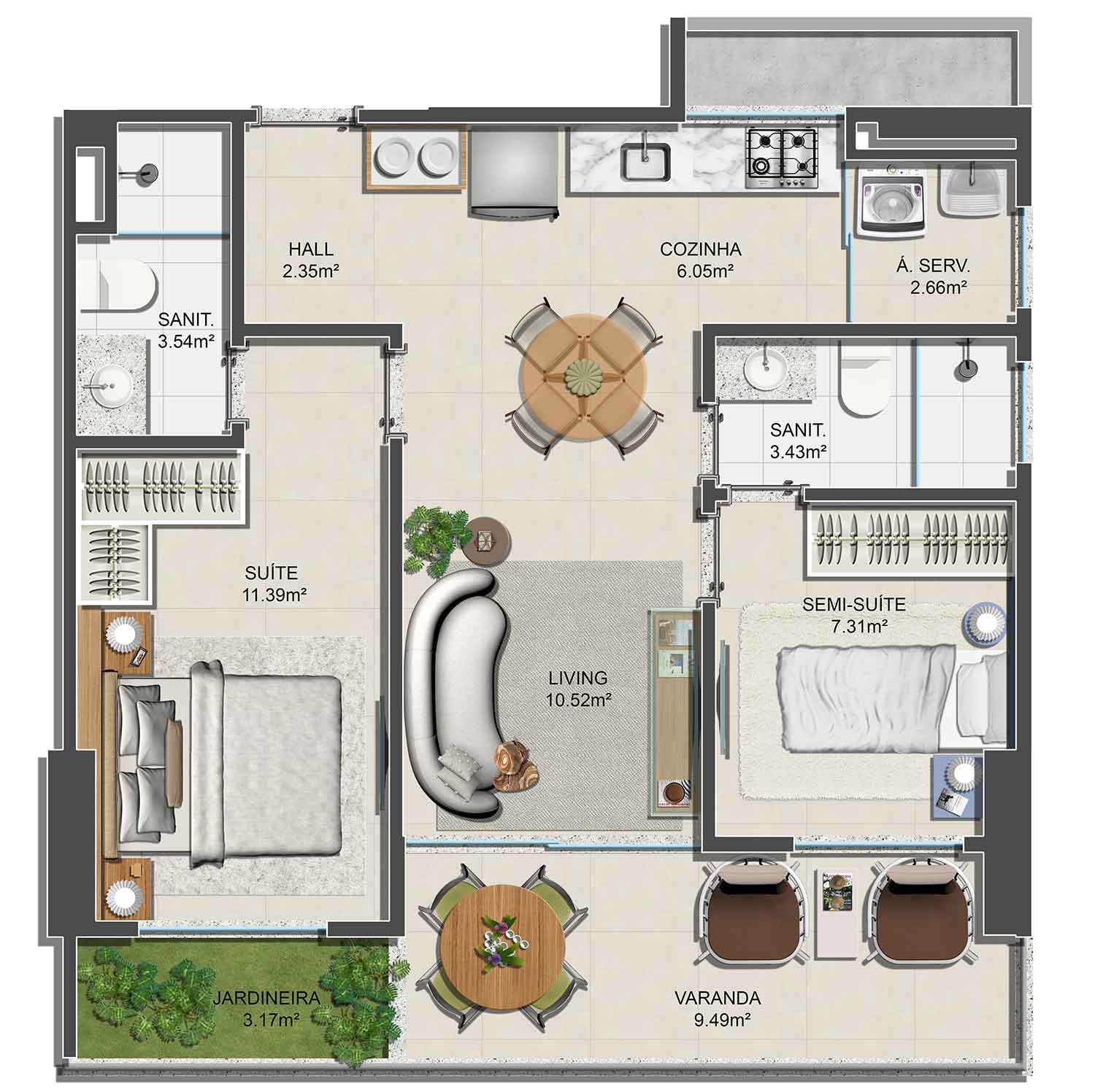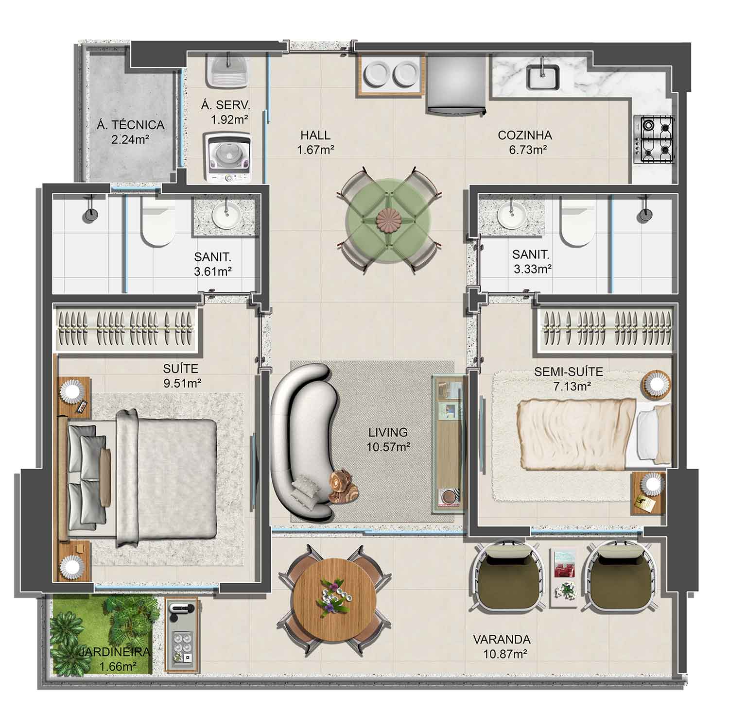São apartamentos com 48m² de 02 quartos com suíte e varanda, e de 59m² com 02 suítes e varanda em um condomínio moderno, com uma infraestrutura completa de lazer garantindo qualidade de vida para todos os membros de sua família.